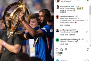 安德烈-桑托斯社媒晒出举起奖杯的照片,配文:“世界冠军,多么美妙的夜晚!”